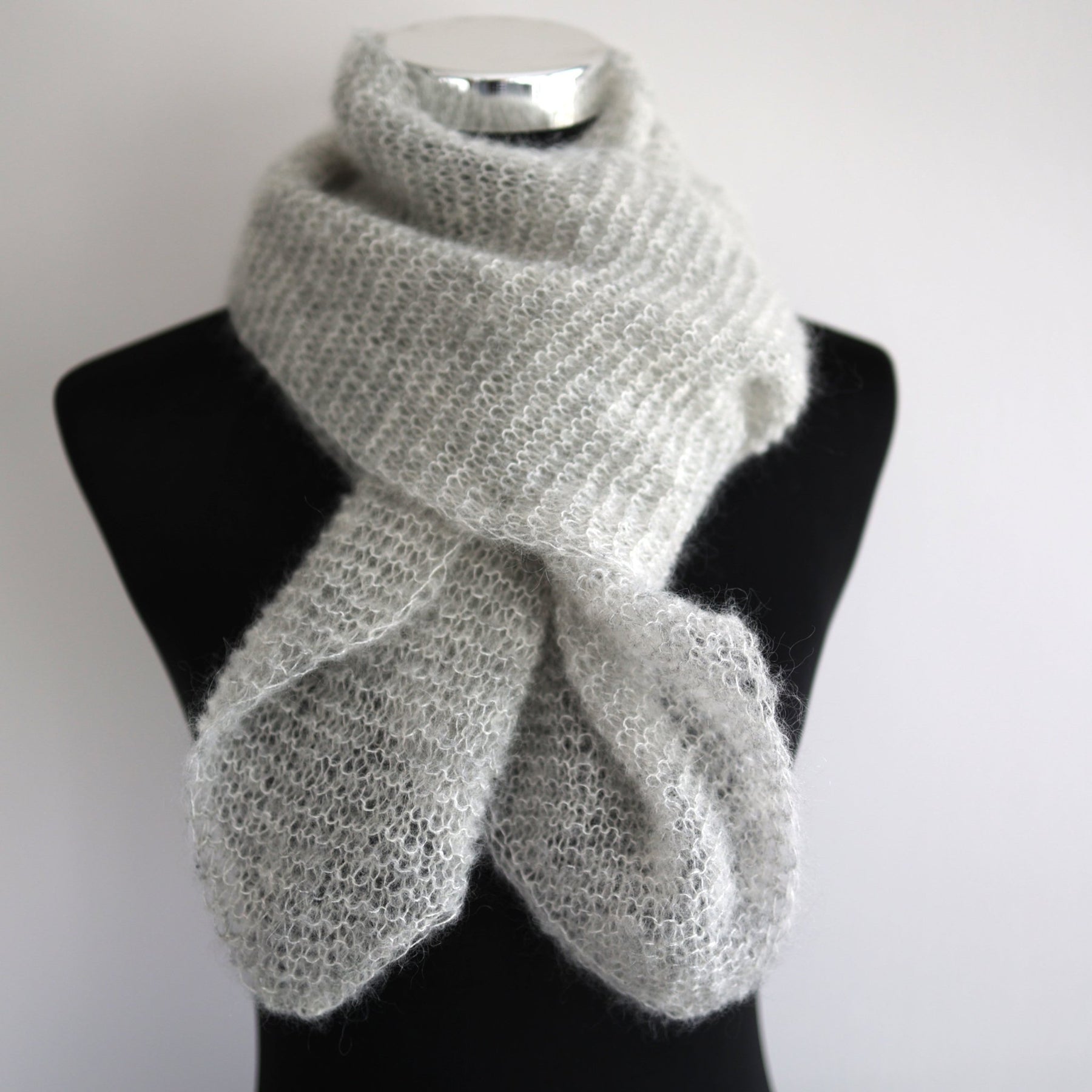 Angaben zum benötigten Material: : 2 Knäuel Mohair mit Seide (z. B. Pro Lana: Farbe 095 Material: 70% Super-Kid Mohair 30% Seide, 210 m / 25 g oder Sandnes Garn: Farbe 8521 støvet lys grønn Material: 57% Kidmohair, 15% Schurwolle und 28% Seide, 25 g / 212 m)